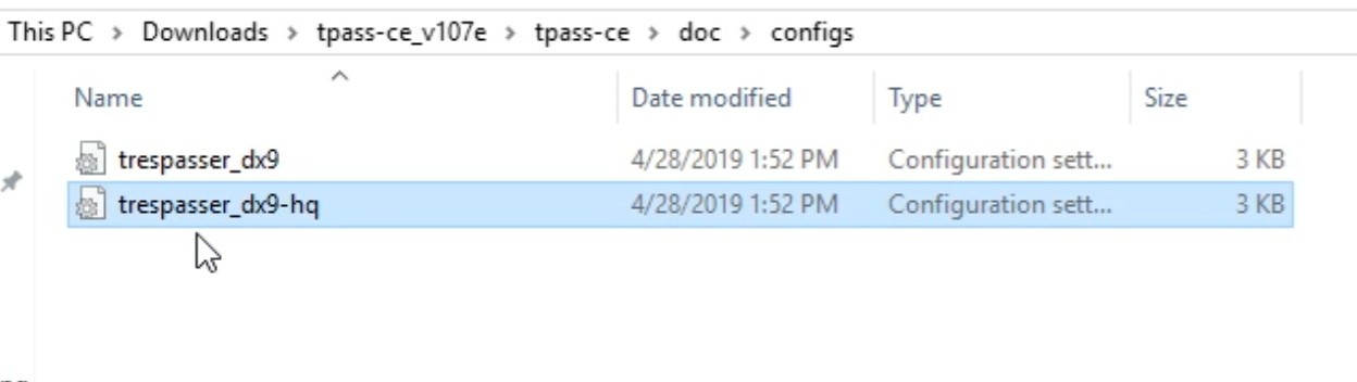 Next click on the doc folder and then the configs folder. Here you will find two config files ready for use. Unless you have a very old PC then you should be fine to run Trespasser at max quality. We’ll want to copy the trespasser_dx9-hq file to the Trespasser install folder.