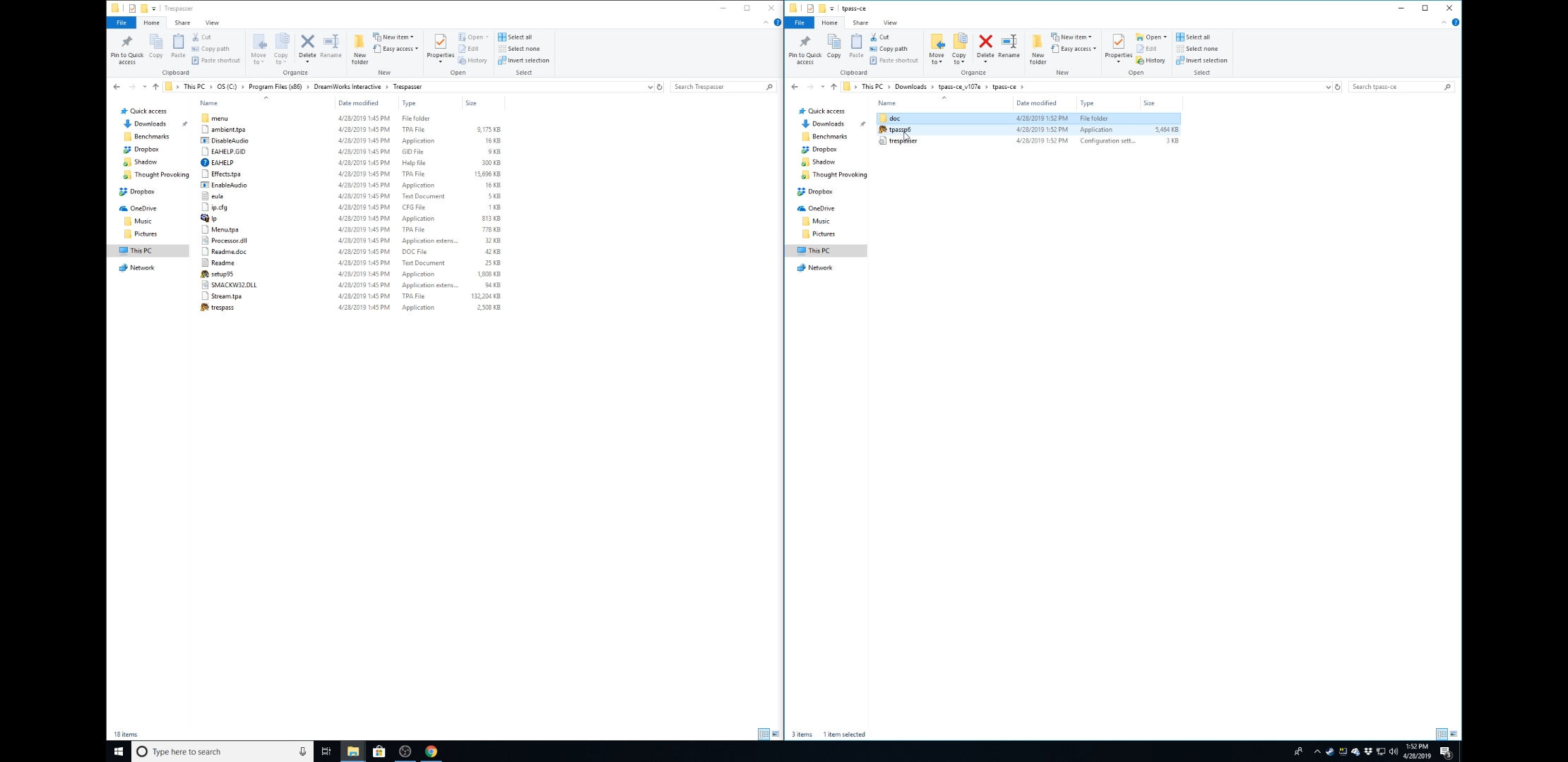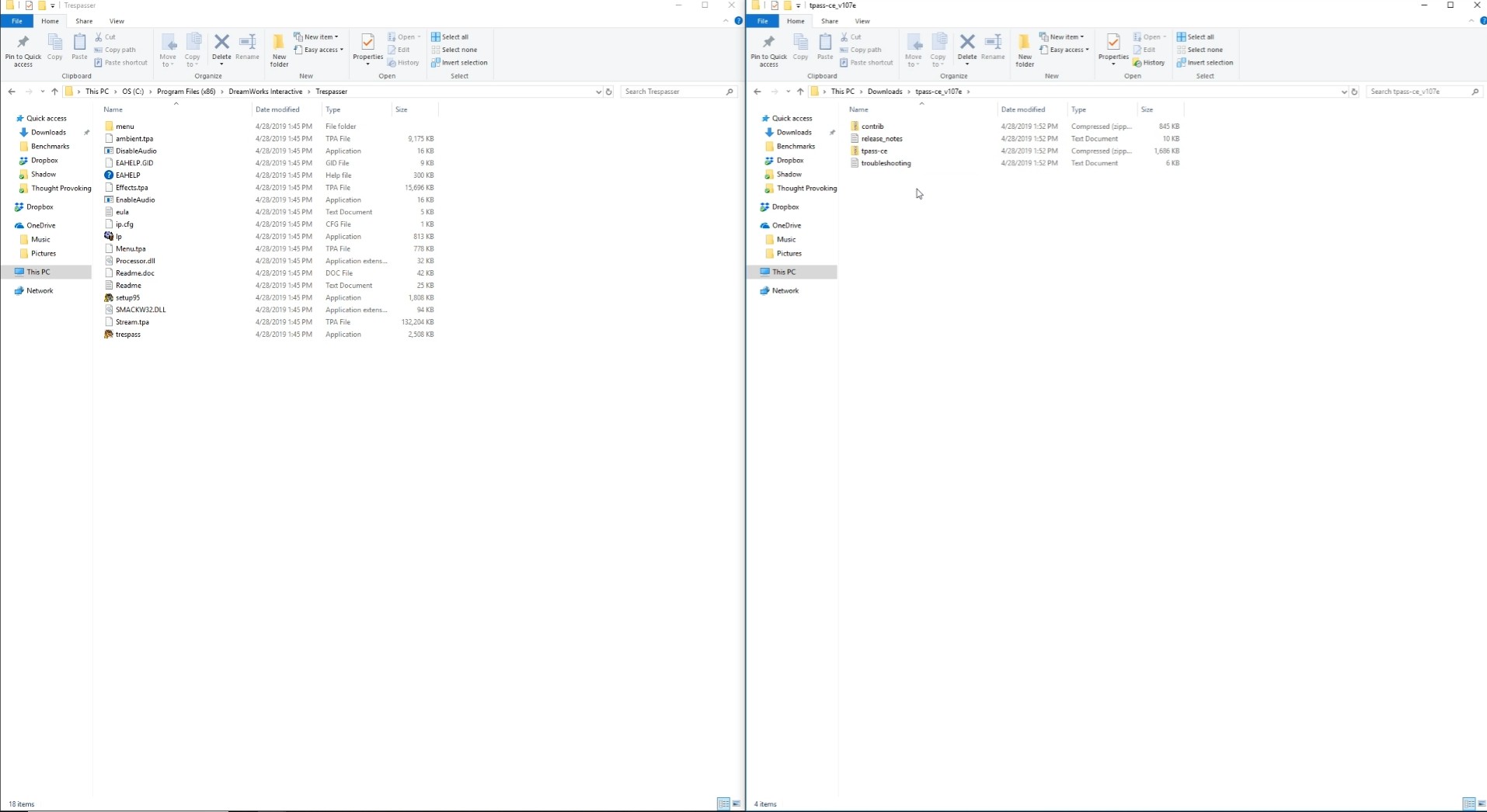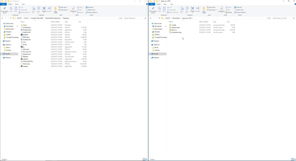 Open the folder that contains the unzipped files(By default it will open itself). Next open another folder and navigate to where you installed Trepasser to in Step 4. In Windows 10 you can drag a window to the edge of your screen to snap it to the right or left half of the screen. Do this for these two folder windows to get a setup like in the below screenshot. This will make it easy to copy our patch files to their destination.
