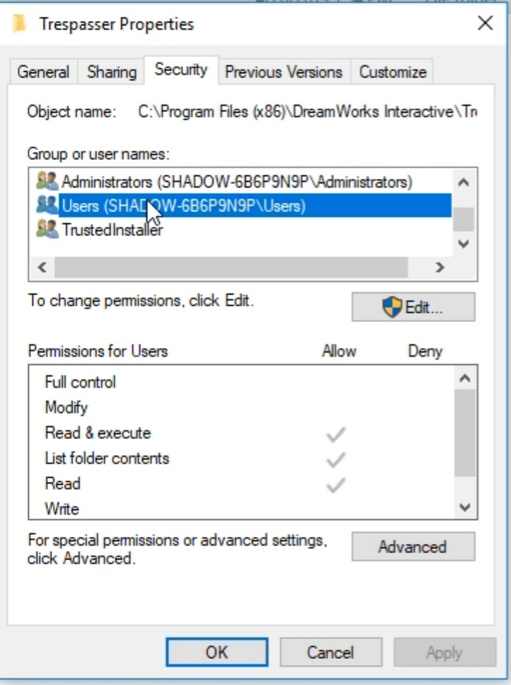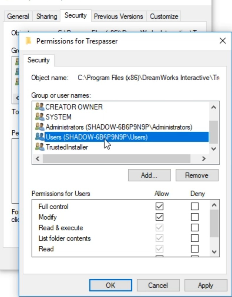 A permissions window will pop and you can give the users full control to the install folder. If you do share a PC with others you may consider adding just write access which is at the bottom of the list. I’ve never had any issues with granting full control though so that is my default method.