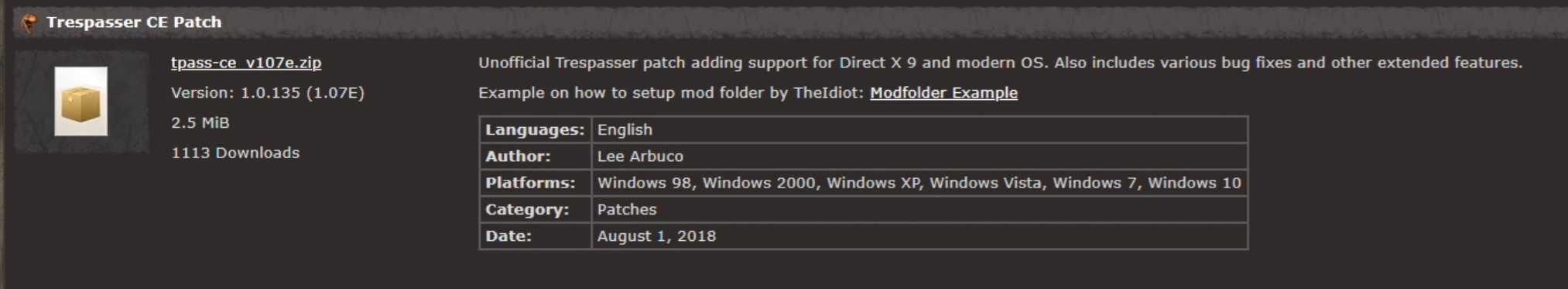 In the patches section on Trescom, we want to download the Trespasser CE Patch. I also have a mirror download hosted here incase you can’t access Trescom for some reason.