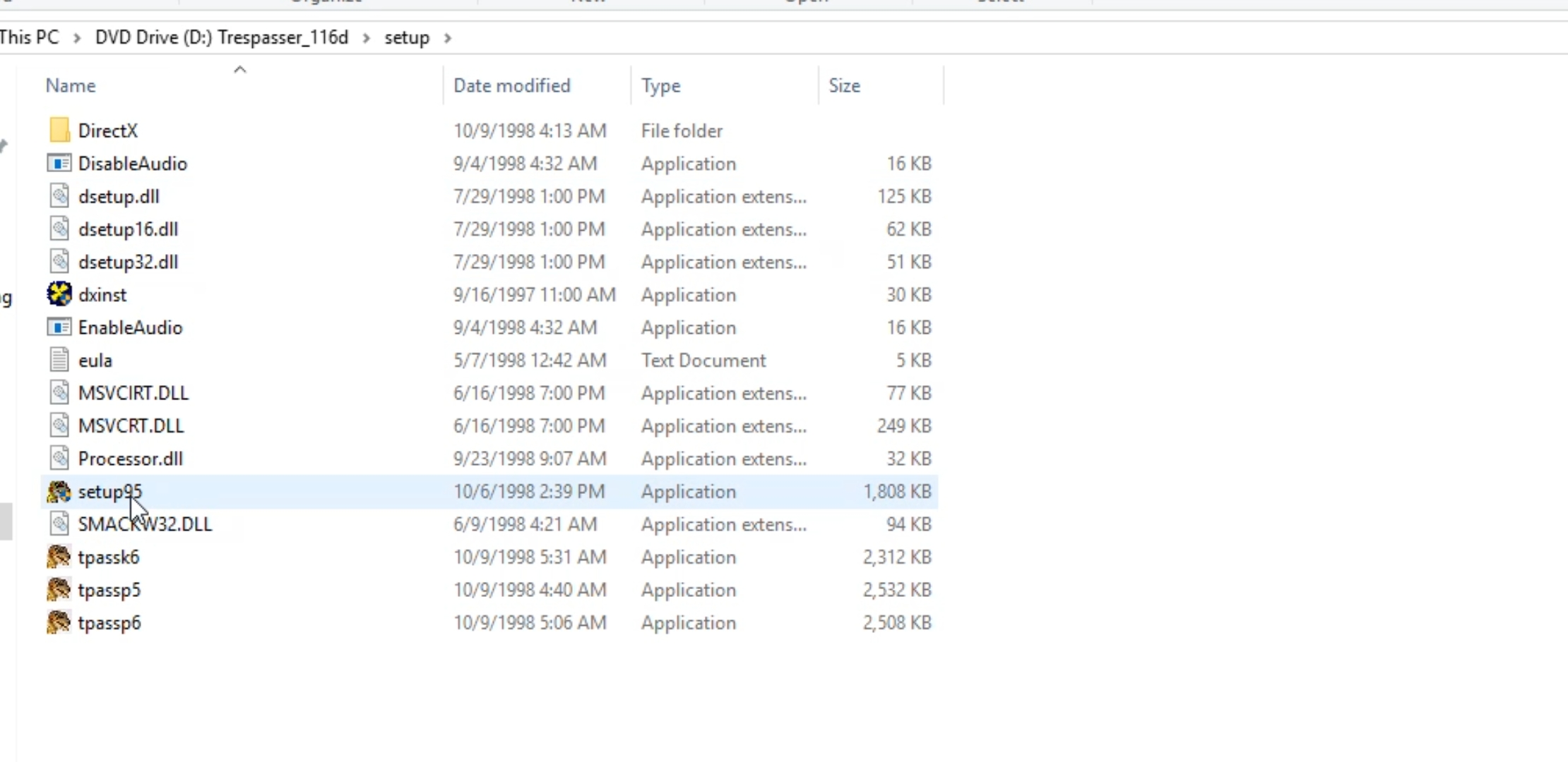 Insert CD for Trespasser into your Computer. If you simply click on the Setup within the CD you’ll get a message stating that “This app can’t run on your PC”. To resolve this go into the setup folder and click on setup95.