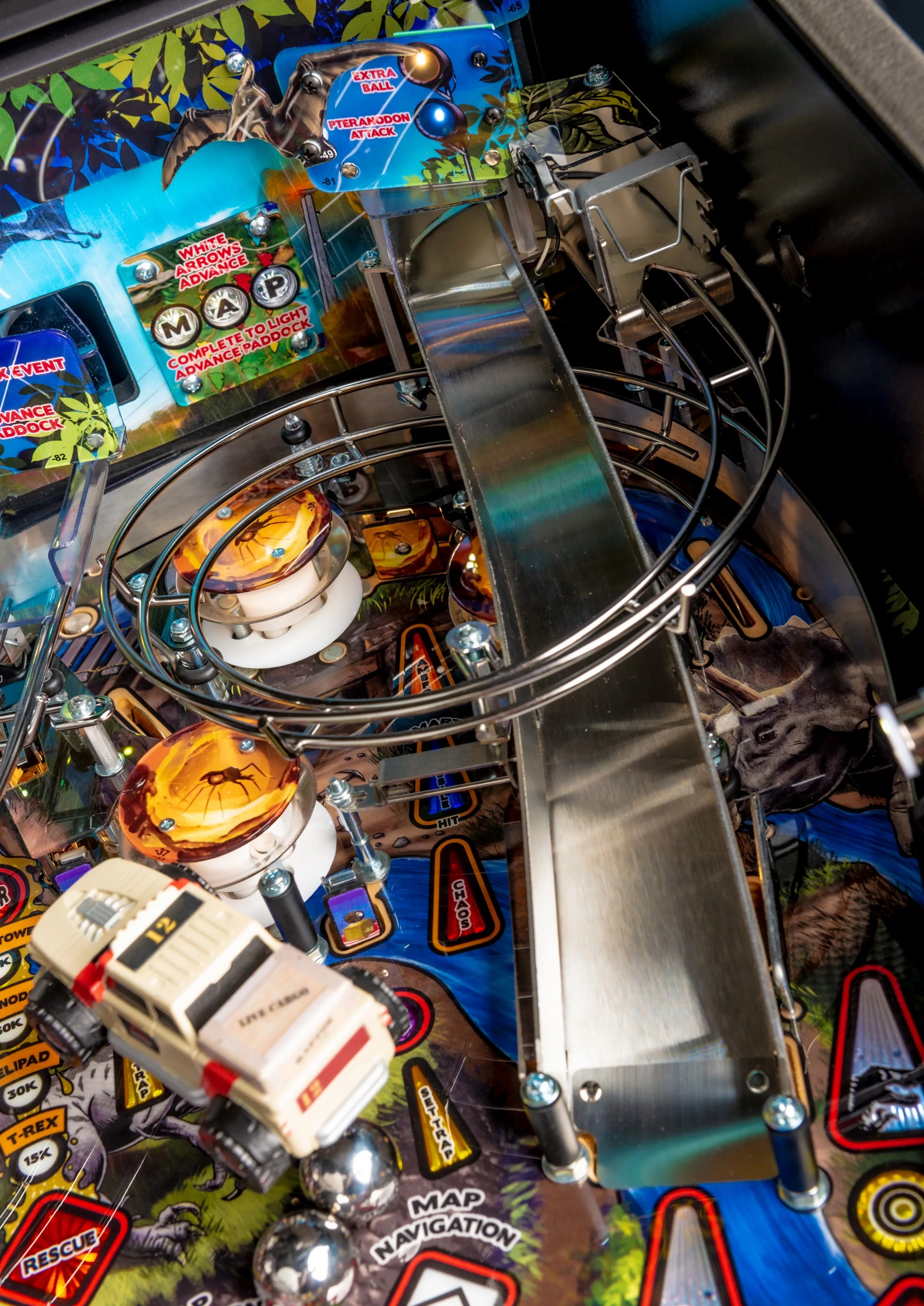 The Premium and Limited Edition models feature an amazing animatronic ball-eating, ball-throwing T. Rex that interacts with the ball and the player. These models also include an interactive Raptor and Raptor Pen featuring a ball-lock mechanism guarded by a motorized gate. The action does not let up with unique mosquito-in-amber pop bumpers and a custom metal horizontal helicopter spinner.