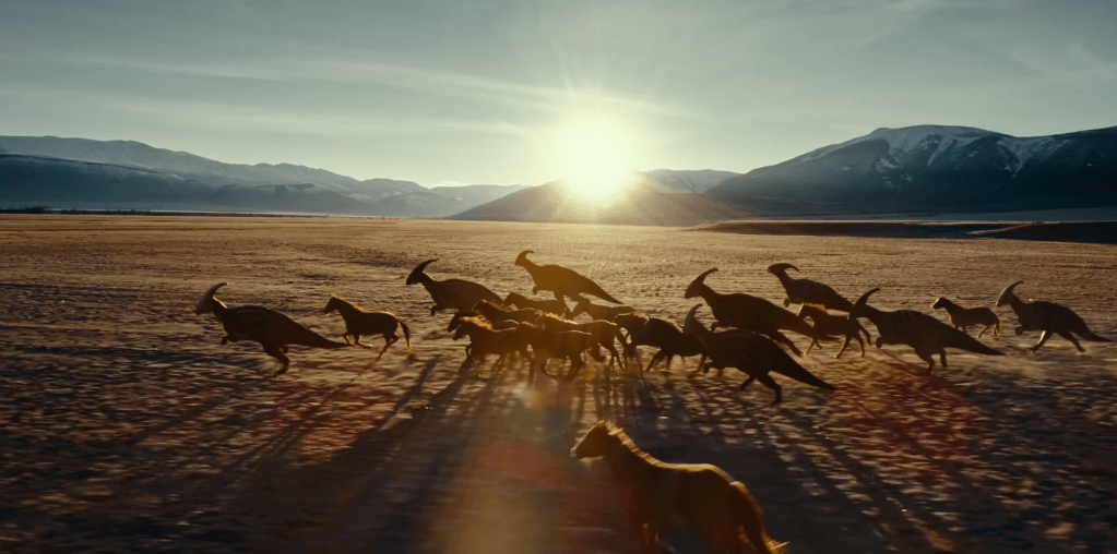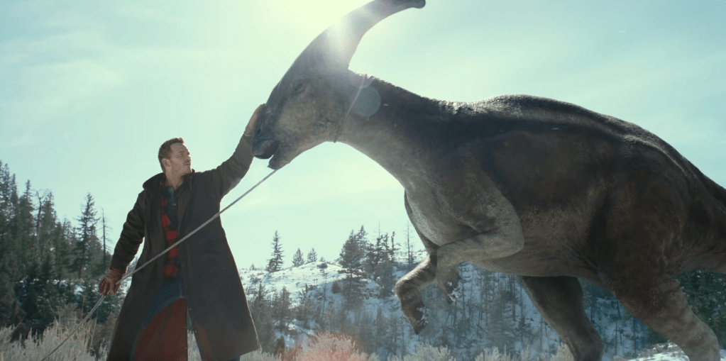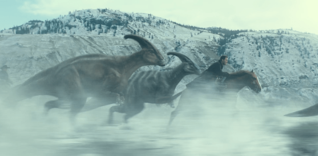 We see the Parasaurolophus a couple times in the trailer. The first is in a snowy scene where we see that Own and his companions capture at least one of the dinosaurs. We do see some interesting colors, with some of the Parasaurs having a zebra-like appearance and others reminding me more of the Lost World coloration. Could this be a male/female separation or are we looking at two different sub-species?