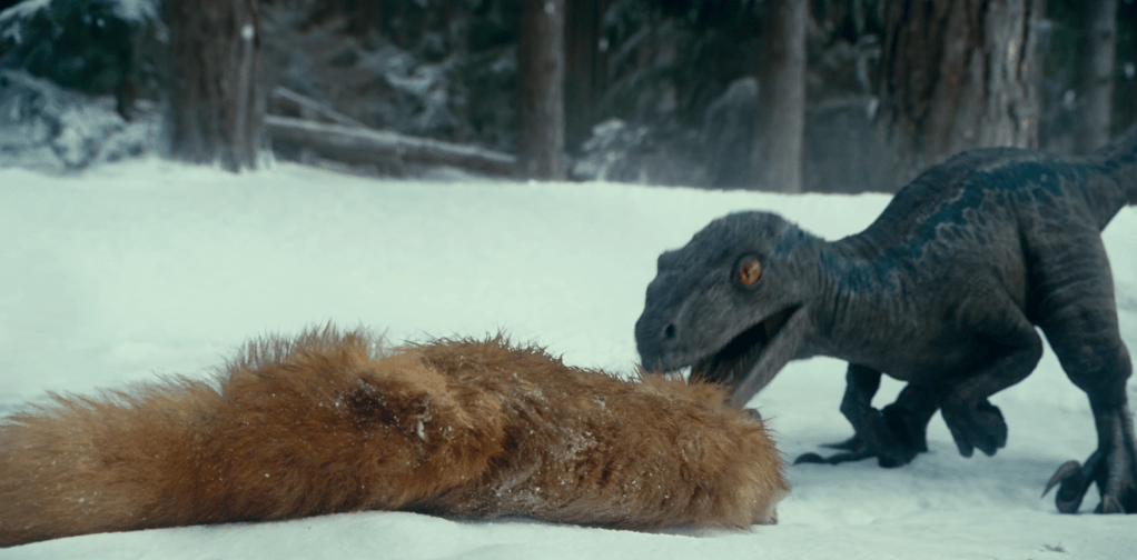 We see Blue and her baby in the trailer several times and in different environments. We clearly see Blue and her baby in different environments. In the snowy environment we see what appears to be a dead fox used as bait to capture Blue’s baby. In the forest with the ferns it appears to be a reunion between the two, so it’s safe to assume that at some point in the movie; Blue’s baby is captured, and they have to rescue it!