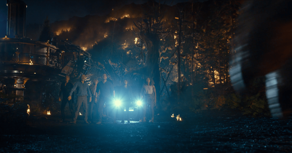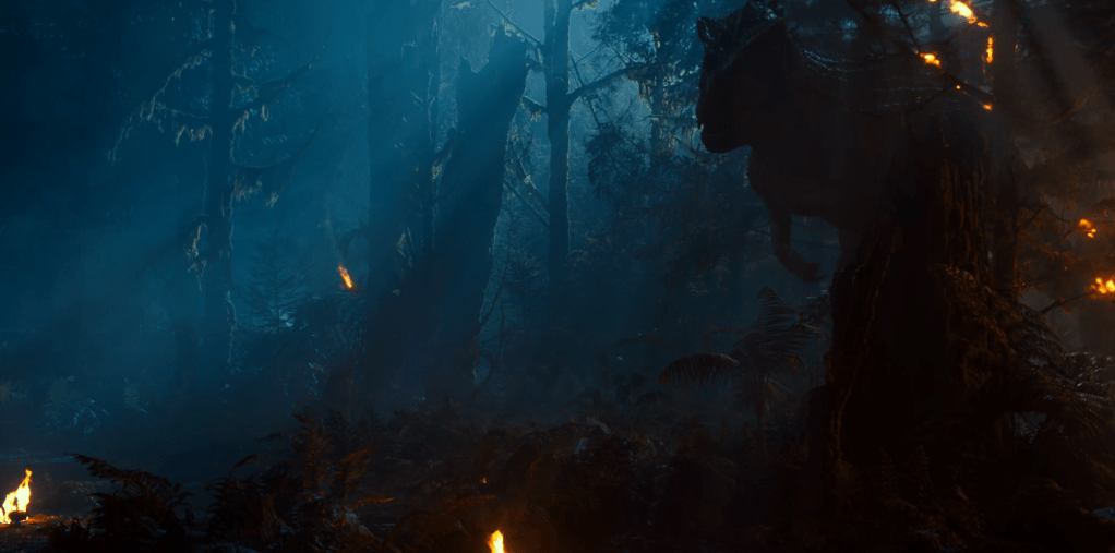 We see the return of the Giganotosaurus from the prologue, facing off against the whole group of our main characters. We also see the forest on fire in the background.