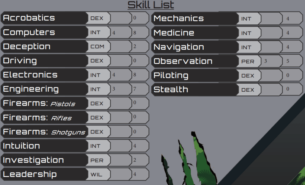 - I want to play a techie so I will spend 5 points on both Computers and Electronics leaving me with 6 skill points. I will split those into Engineering and Observation.